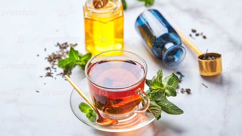 Черный чай в стеклянной прозрачной кружке с листьями мяты и медом. Успокаивающий и восстанавливающий чай, антистресс и релаксация