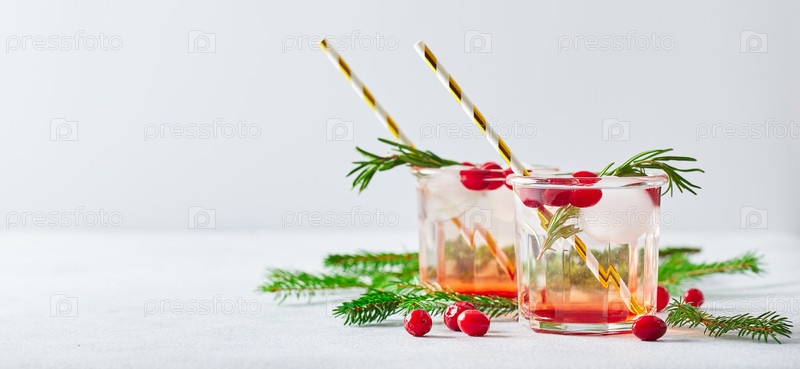 Алкогольный коктейль или безалкогольный коктейль с водкой и ледяной клюквой с еловыми ветками на рождество. Длинный широкий баннер