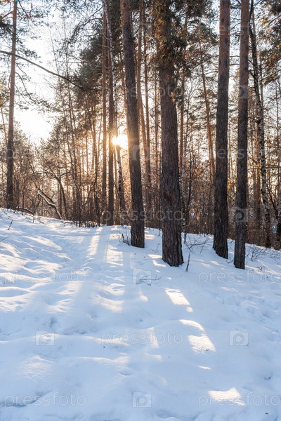 Низкое зимнее солнце светит сквозь деревья в сосновом лесу и солнечную дорожку и тени от деревьев на снегу