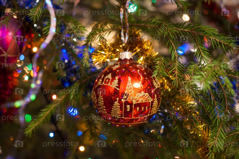 Елочная игрушка красный стеклянный шар, раскрашенный золотом, висит на елке
