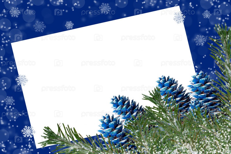 Заснеженные еловые ветки и синие шишки на синем фоне со снежинками и копией пространства на белом чистом листе