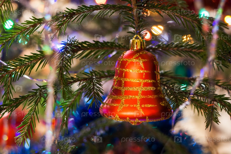 На елке висит крупный рождественский колокольчик, раскрашенный золотом