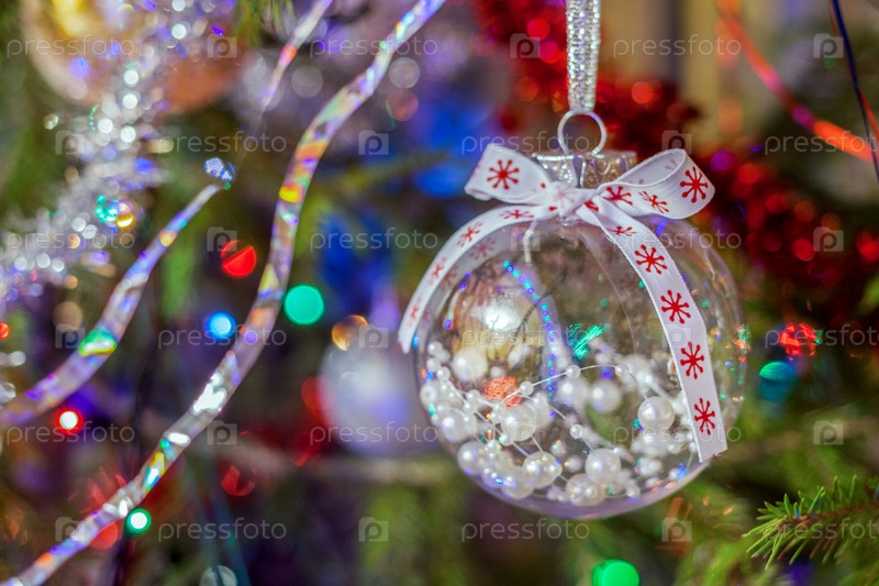 Рождественская игрушка прозрачный пластиковый шар с белыми бусинами внутри висит на елке