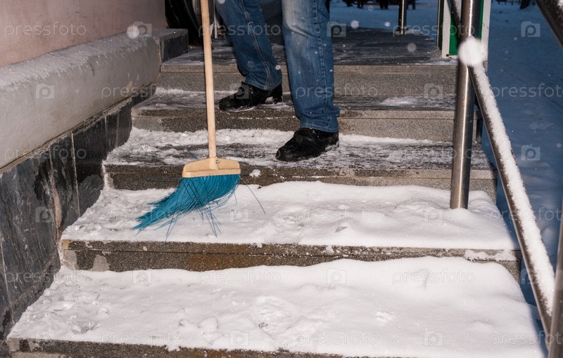 Мужчина чистит заснеженные ступени дома метлой
