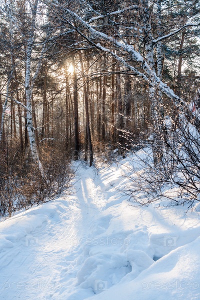 Солнце светит сквозь деревья и освещает тропу в зимнем лесу