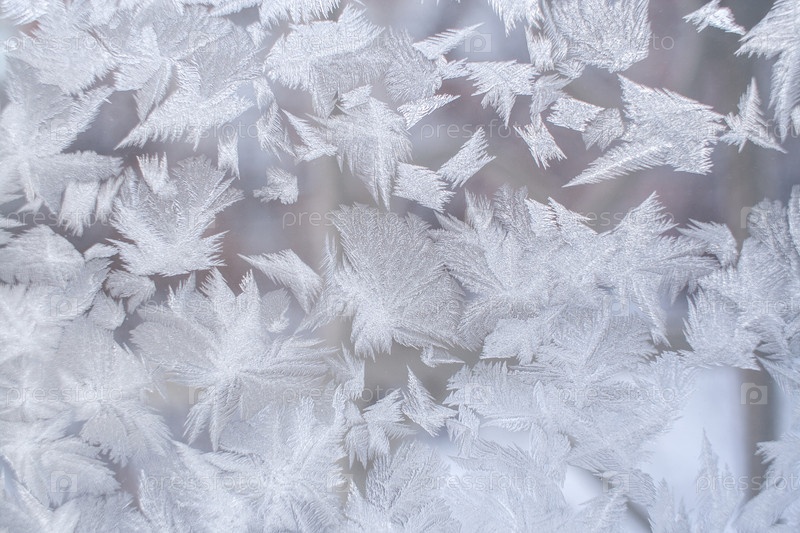 Рождественский фон. Красивый морозный узор в виде огромных остроконечных снежинок на оконном стекле