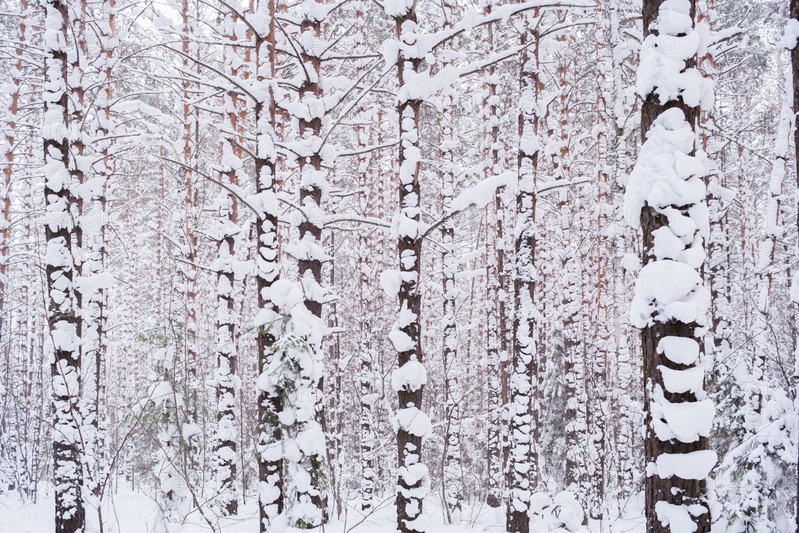 Зимний лес. Многие заснеженные сосны в пасмурный зимний день