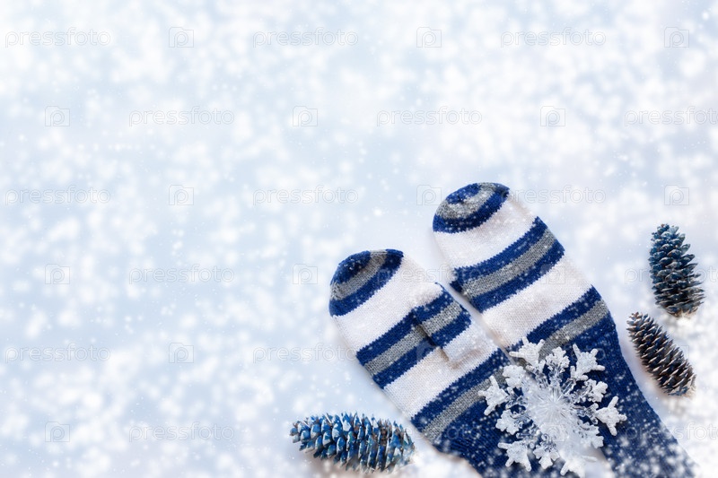 Рождественский фон с бело-синими полосатыми варежками, тремя еловыми окрашенными синими шишками, одной снежинкой и местом для копирования