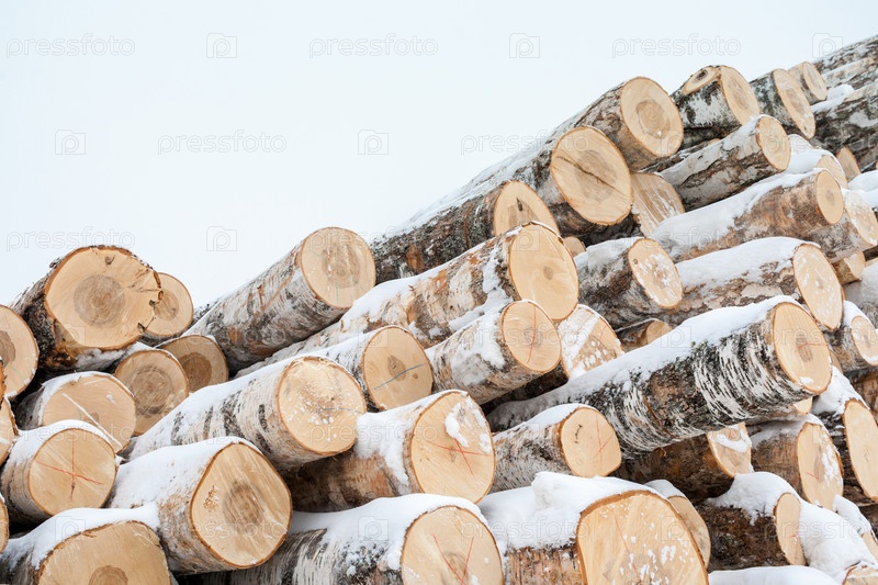 Куча множества свежих спиленных березовых бревен, зимой покрытых снегом. Диагональный вид сбоку