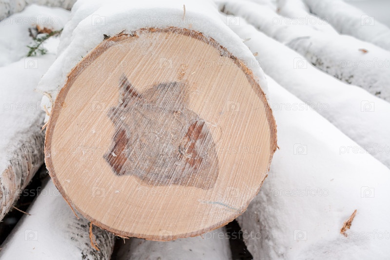 Крупный план покрытой снегом свежеспиленной березы зимой