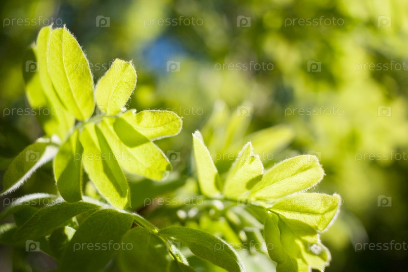 Весенний размытый фон с мягким фокусом с залитыми солнцем молодыми зелеными листьями рябины