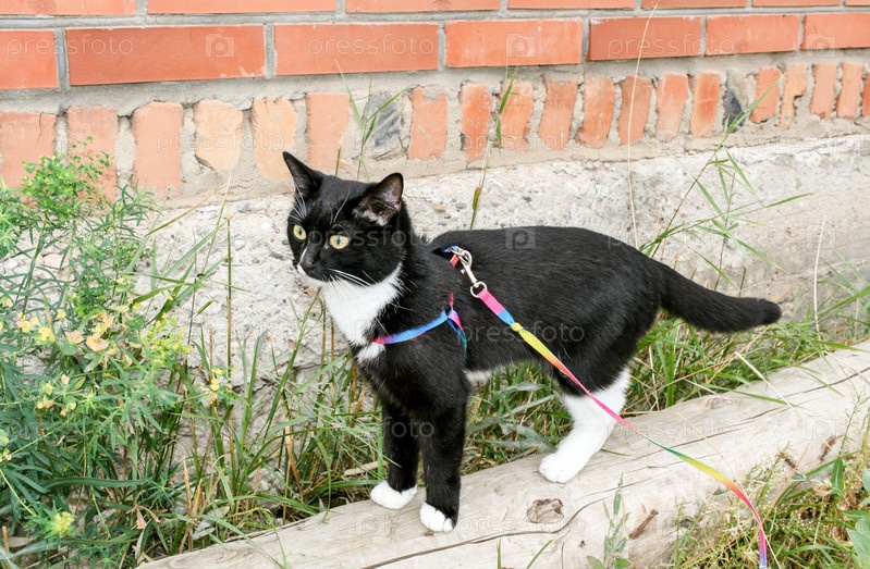 Молодой черно-белый кот ходит на упряжке по деревянной балке вдоль кирпичной стены летом