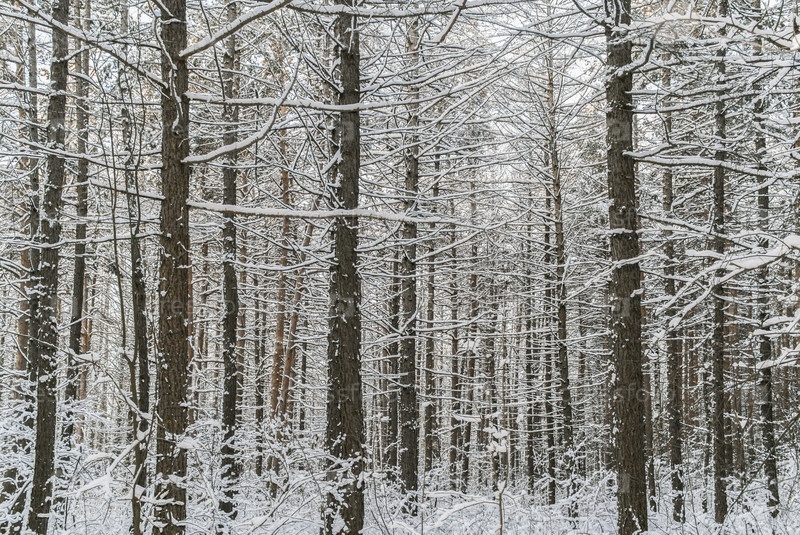 Зимний лес. Много заснеженных стволов сосен, трава под ними и белое небо над головой