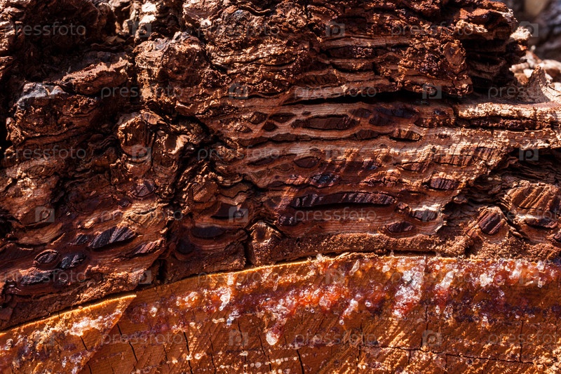 Крупный план смоляных шариков и толстой коры на распиле лиственницы