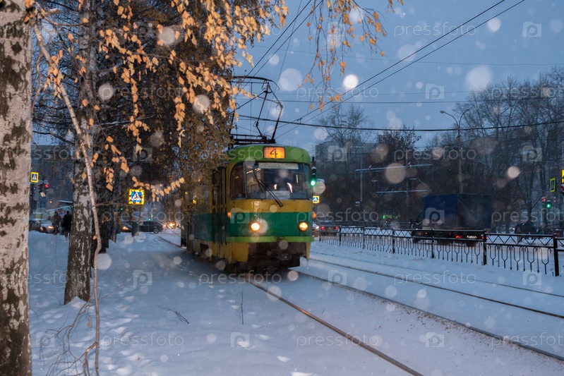 Зелено-желтый трамвай едет по городу во время снегопада в сумерках