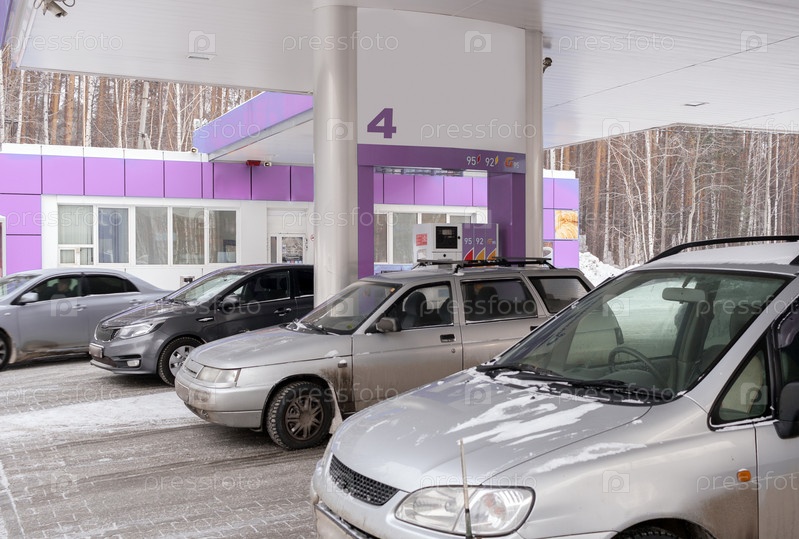 Несколько серых автомобилей на заправке возле леса