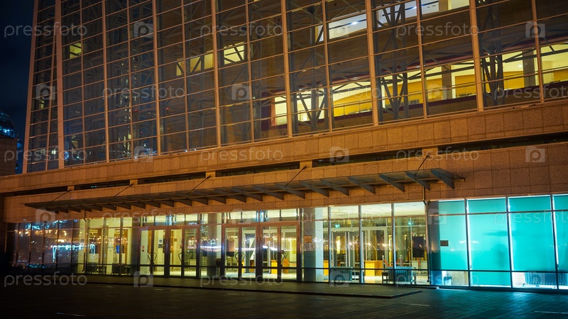 Владивосток, Россия - 18 августа 2019 г.: Ночной пейзаж с видом на архитектуру Мариинского театра, освещение украшает современное здание