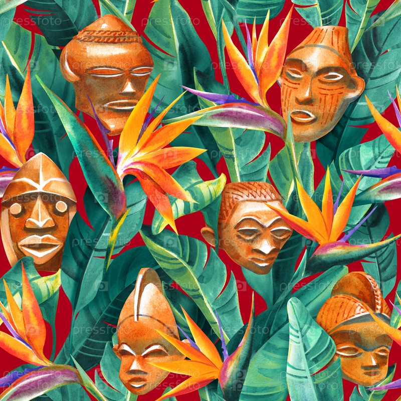 Бесшовный паттерн с африканскими масками, цветами стрелиции и листьями на темно-красном фоне