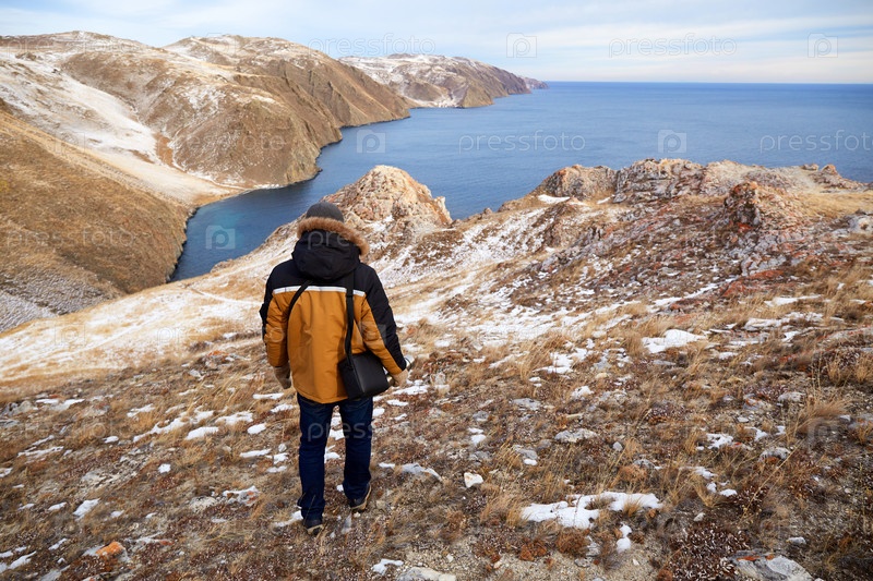 Байкал в декабре. Мужчина любуется красивым зимним пейзажем, путешествуя пешком по природе