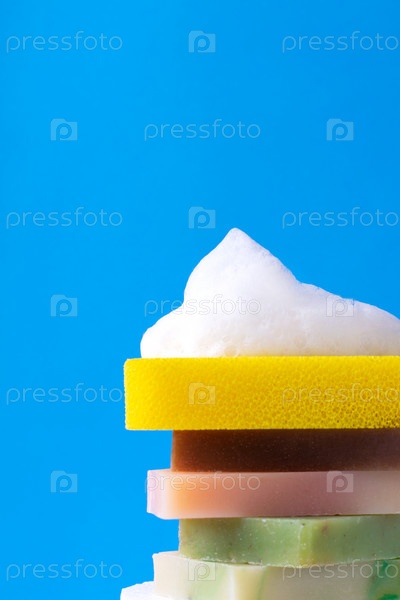 Стек с губкой для тела с пеной на разных кусках мыла на синем фоне. Средства по уходу за телом и гигиена
