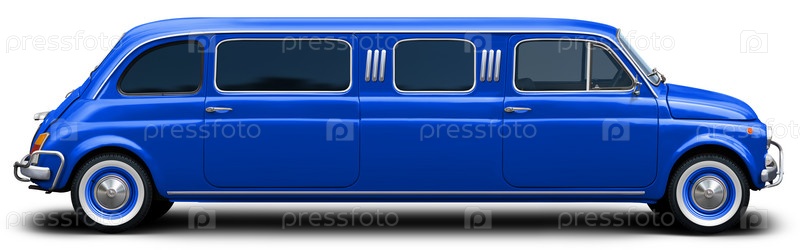 Лимузин на базе небольшого классического европейского автомобиля Fiat 500 полностью синего цвета