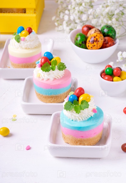 Разноцветные мини-чизкейки с карамельными яйцами и взбитыми сливками. Пасхальный десерт в пастельных тонах