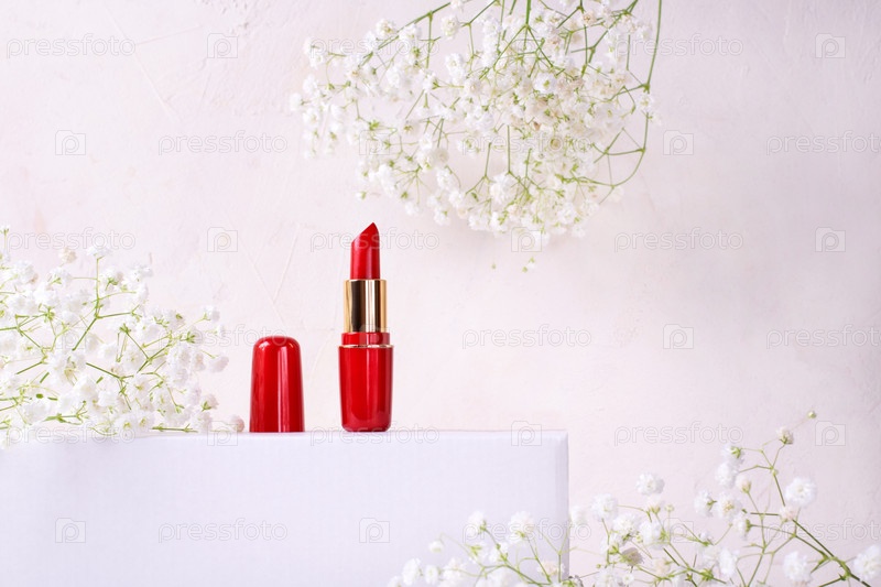 Красная помада на белом подиуме и белые цветы гипсофилы вокруг. Косметический продукт