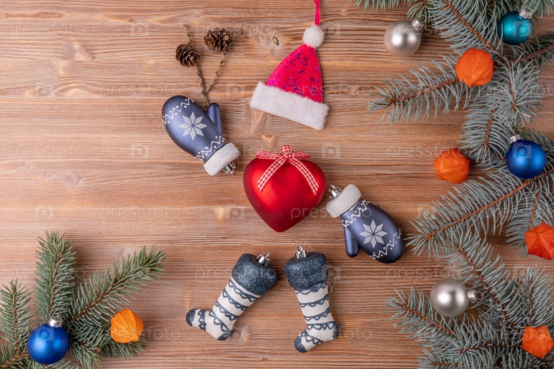 Рождественский фон с елкой и украшением на темной деревянной доске. Новый год