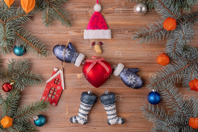 Рождественский фон с елкой и украшением на темной деревянной доске. Новый год