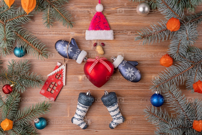 Рождественский фон с елкой и украшением на темной деревянной доске. Новый год