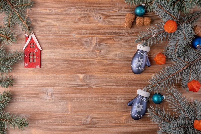 Рождественский фон с елкой и украшением на темной деревянной доске. Новый год