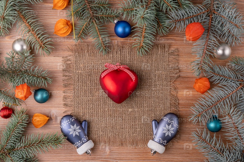 Рождественский фон с елкой и украшением на темной деревянной доске. Новый год