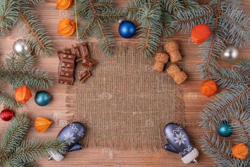 Рождественский фон с елкой и украшением на темной деревянной доске. Новый год