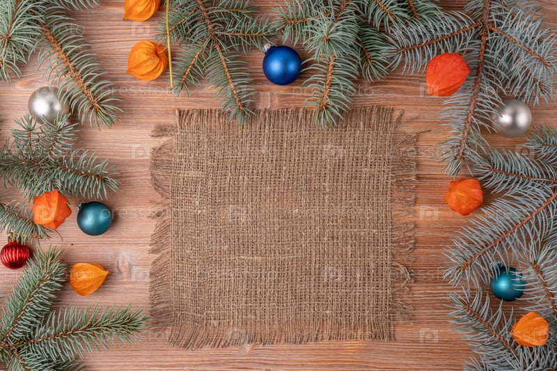 Рождественский фон с елкой и украшением на темной деревянной доске. Новый год