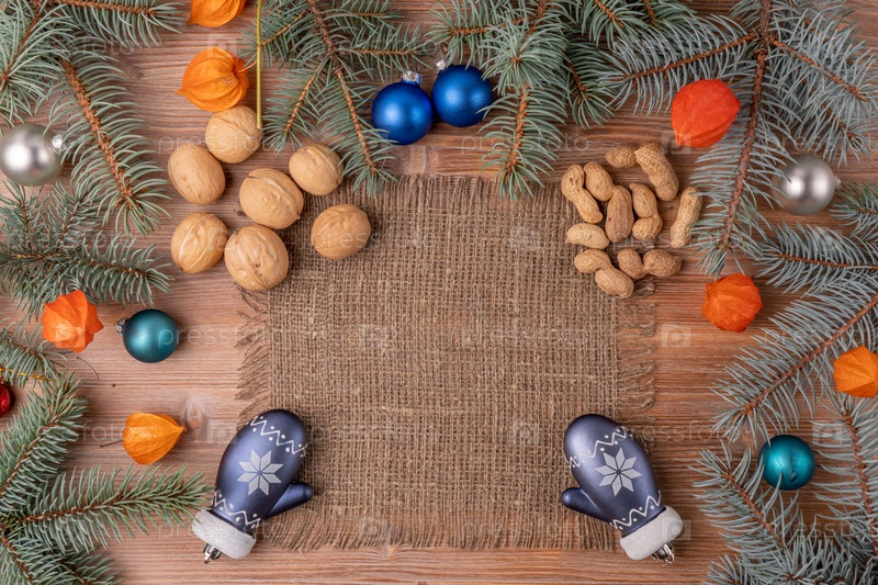 Рождественский фон с елкой и украшением на темной деревянной доске. Новый год