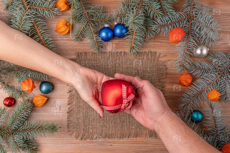 Рождественский фон с елкой и украшением на темной деревянной доске. Новый год