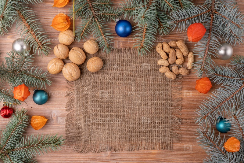 Рождественский фон с елкой и украшением на темной деревянной доске. Новый год