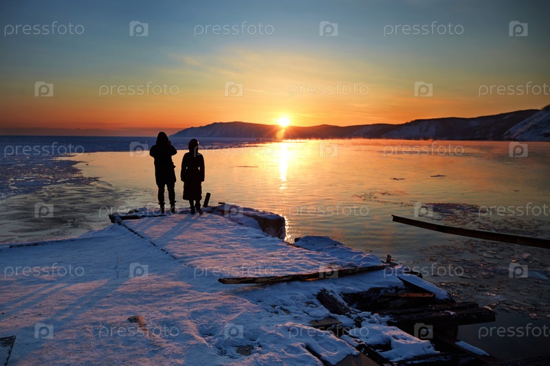 Закат на весеннем озере Байкал. Молодая пара любуется закатом над озером