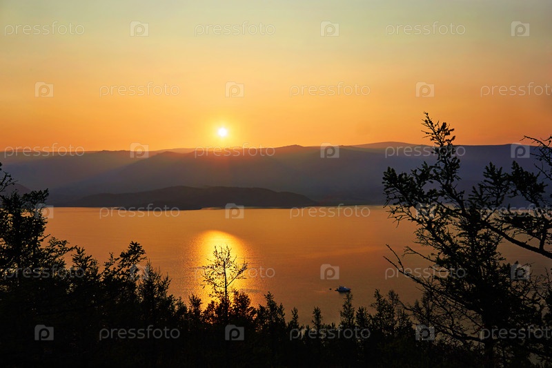 Красивый оранжевый закат над горами летом. Лучи заходящего солнца отражаются в Байкале