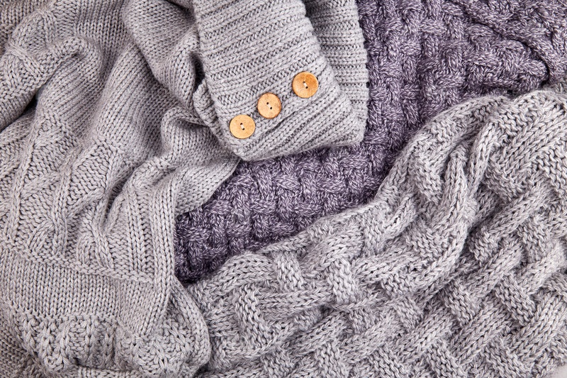Куча разбросанных серых вязаных свитеров и шарфов