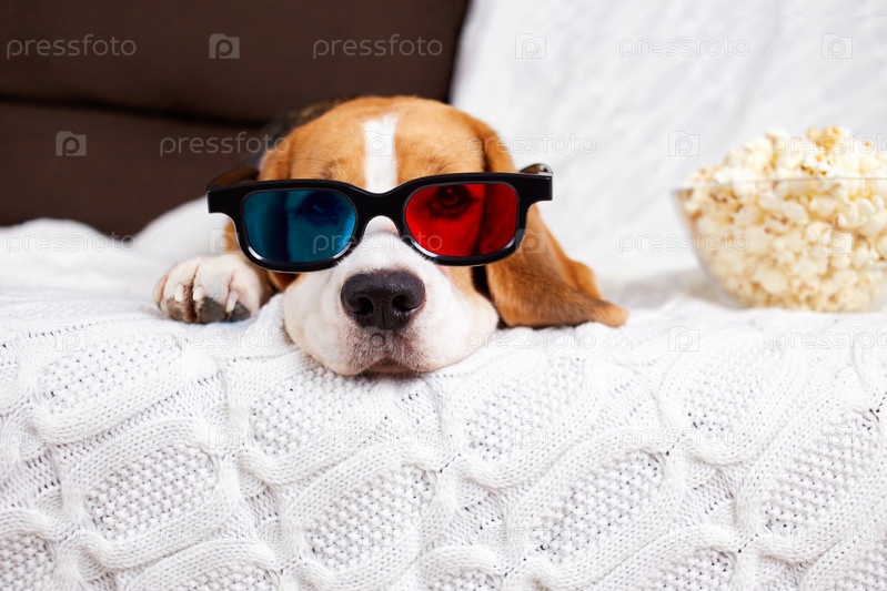 Милая собака Бигл в 3D-очках лежит на диване и смотрит фильм
