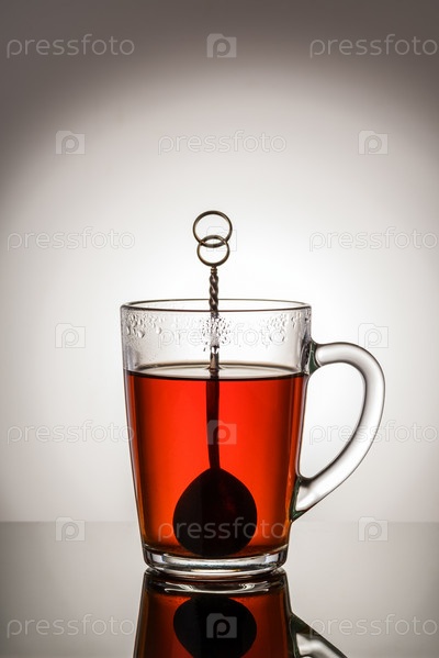 Черный чай в стеклянной чашке с ручкой и чайной ложкой. Фото сделано в студии