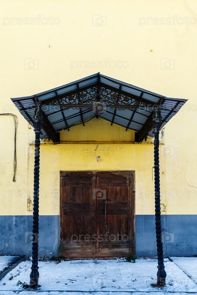 Деревянная дверь с кованым крыльцом в стене старого здания. Снимок сделан в России, в городе Оренбург