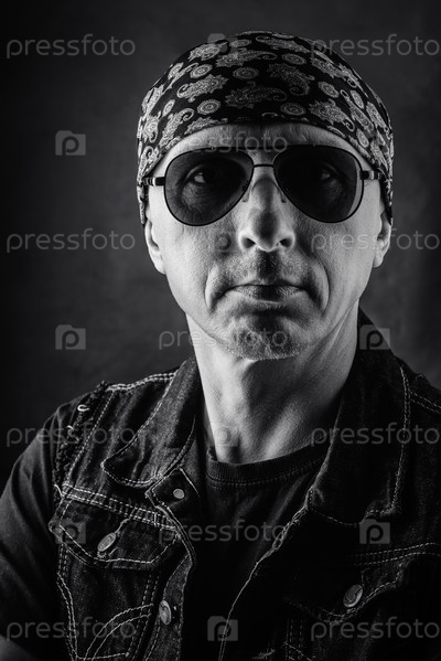 Небритый мужчина средних лет в футболке, джинсовой жилетке, бандане и солнцезащитных очках. Черно-белый портрет. Фото сделано в студии