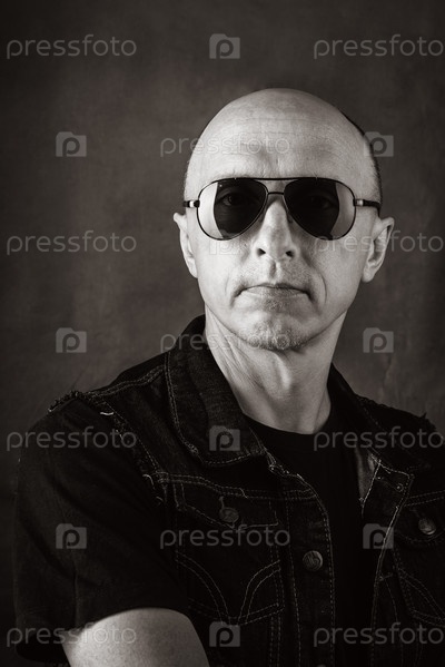 Небритый лысый мужчина средних лет в черной футболке, джинсовой жилетке и темных очках. Черно-белый портрет в сепии. Фото сделано в студии