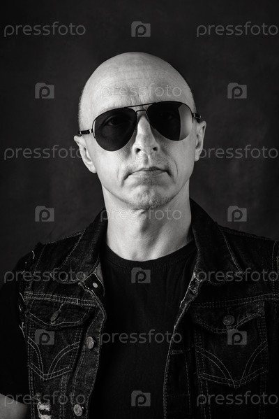 Небритый лысый мужчина средних лет в черной футболке, джинсовой жилетке и темных очках. Черно-белый портрет. Фото сделано в студии
