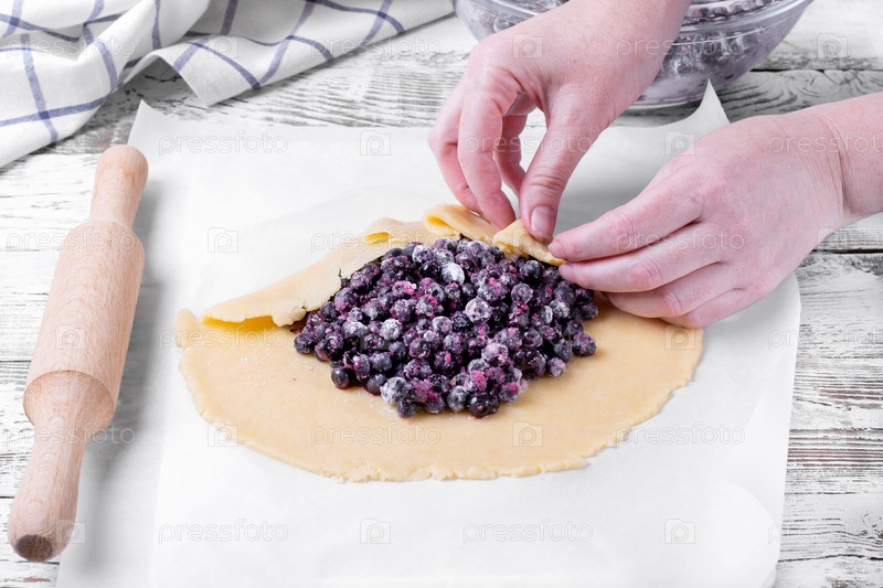 Формирование галет с песочным тестом и черникой на белом столе. Процесс приготовления десерта