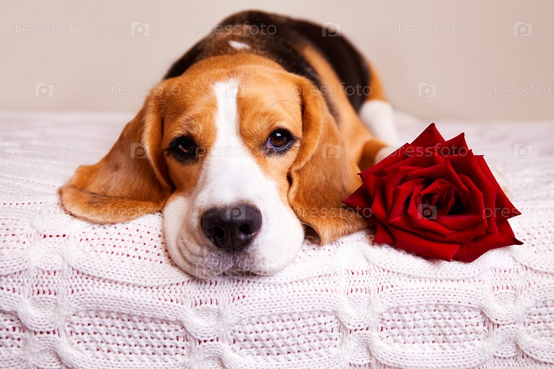 Милая собака бигля на кровати с красной розой