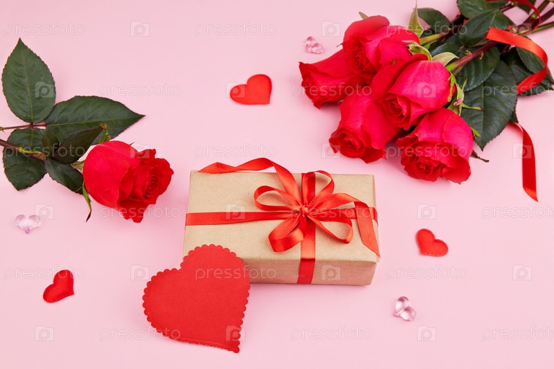 Букет красных роз, коробка в крафт-пакете с красной лентой
