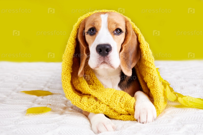 Собака-бигль в вязаном желтом снуде или шарфе лежит на диване